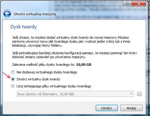 - W następnym oknie wybieramy opcję – Stwórz wirtualny dysk twardy – i klikamy – Utwórz –