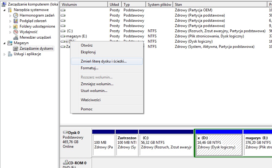 - Wybieramy interesujący nas dysk i klikamy na nim opcję “Zmień litery i ścieżki dysku”
